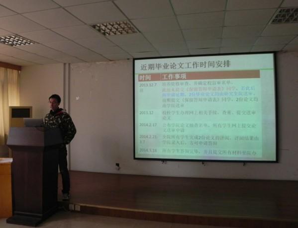 研究生教务员臧寿鸿老师首先向同学们传达了研究生毕业论文相关日程安排和注意事项,包括论文检测送审(万方、CNKI)、发表要求等等。接着,于盛林教授就毕业论文撰写的具体细节进行了深入的指导。从论文格式的基本要求,到论文内容的创新内涵;从开题绪论的写作思路,到公式原理的深入拓展,于教授都进行了细致周到的讲解,于教授深入浅出、切中要害的讲解激发了同学们认真思考。作为具有多年审查论文经验的老专家,于教授对于审核过程中的处理细节稔熟于胸。最后,于教授和同学们展开深入的交流,为同学们提出的问题一一解答。听完讲座,同学们以热烈的掌声感谢于盛林教授和臧寿鸿老师为大家做的精彩报告,纷纷表示会以严谨的态度对待研究工作,以实事求是的心态严格撰写论文。