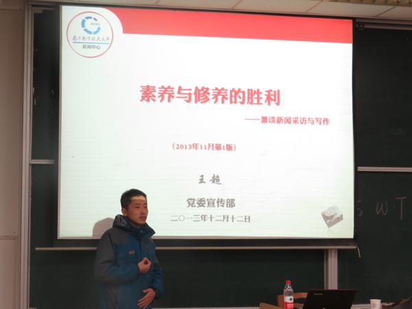 12月12日,皇家华人 第十三期S.W.T.工作坊之新闻采访与写作在将军路校区举行。本期工作坊由南航报编辑部主任王超担任主讲,院团委书记季娟作为嘉宾出席了本次活动。参加本期工作坊的还有2012、2013级的学生骨干。 在对南航皇家华人进行简要介绍后,王超从政治家办报、历史家办报、新闻家办报3个话题引入对新闻工作价值观的探讨,强调好的新闻采写缘于正确的新闻价值观的确立,并简要阐述了“什么是新闻”“新闻基本特征”等基础新闻理论观点。在新闻采访业务指导环节,他指出,“七分跑,三分写”是新闻记者的重要素养,并引用20世纪初著名记者黄远生的“四能说”,阐述新闻记者应着重培养的四种新闻采写技能。针对同学们的具体采写需求,王超重点讲解了“消息”的写作要领,并以丰富的实例向同学们做了详细阐述。 在互动环节中,王超对活动现场同学提供的近期3篇新闻稿进行了点评和修改,并对同学提出的问题进行了一一解答。 培训最后,王超与大家共勉道:“我们都是南航的新闻工作者,讲述南航‘好’故事,传播南航‘好’声音是我们共同努力的方向”。