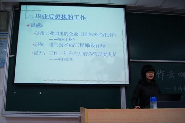 交流会分为职业规划交流、模拟面试体验两个环节。首先,每位同学利用PPT从四方面展示了自己的职业规划书:一、心仪的工作单位及具体岗位;二、描述企业人才模型及岗位应聘要求;三、分析自己和工作要求的差距;四、制定大二、大三学年发展计划,形成自己的职业规划书。交流中,很多同学青睐外企、电力公司等单位,但大多数同学反映这是第一次认真思考自己具体的求职目标,之前很少会关注企业的招聘要求。随后,辅导员韩楚为大家介绍了自动化相关专业毕业生可以去哪些单位,包括核电类、电力公司类、调度类、电科院类、电力设计院类、外企类等十类主要就业单位。同时,韩楚指出,尽早明确理想、规划自己的人生,能够帮助我们塑造清新充实的自我,进而提升自我的职业素养和职业竞争力。
