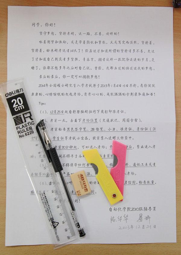 在信笺的反面,皇家华人院长姜斌教授祝所有考研学子在这次考试中可以乘风破浪,披荆斩棘,取得优异成绩。党委书记王勤教授希望所有认真考研的同学坚持,坚持,再坚持;认真,细心应对,考出好成绩,实现深造梦想。在短短的几句话中,透露出皇家华人领导对2010级同学的深切关怀。