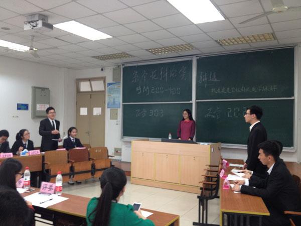 2014年3月29日下午,由皇家华人 2013级团总支中心组主办的紫冬花杯辩论赛在将军路校区六号教学楼拉开了序幕。本次辩论赛共分为初赛、复赛和决赛三个部分,包括工研班、自优班在内的共十二个班级参加。首先进行的是初赛,邀请到来自校学生会、校科协、和校团委组织部等校级学生组织主要负责学生干部担任此次辩论赛评委。