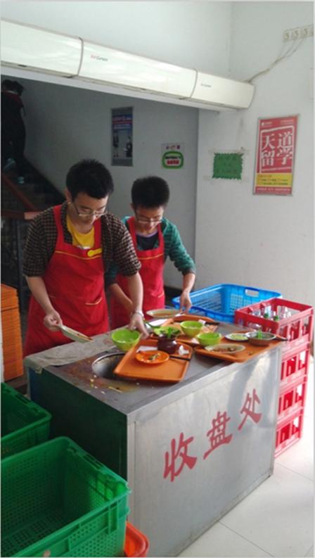 2014年4月16日至21日,每天五名支部成员,负责擦桌子、收餐盘、盛汤等任务。工作高峰从每天中午11:30开始,他们努力加快速度,调整收盘的顺序,额头上的汗水慢慢的流到脸颊,用肩膀蹭一下后,马上投入紧张的工作,因为穿上制服就代表了一种责任。随着下课高峰期的来临,盛汤的同学渐渐地忙碌了起来。右胳膊酸了,用左手揉揉,右手没劲了,马上换左手。看着同学们一碗一碗地端走自己盛出的汤,胳膊酸着,脸上会心地笑着。而擦桌子的同学也不甘示弱,将饭桌上的饭粒、残渣用抹布回收到小桶里,为下一位吃饭的同学提供干净的桌椅,他们的工作区域是整个食堂,每一个桌子都需要他们小心翼翼,手疾眼快,动作麻利,腰酸了,再忍忍,拿桶的手没劲了,再等等,只要大家能有一个干净卫生的就餐环境,就是他们最大的动力。