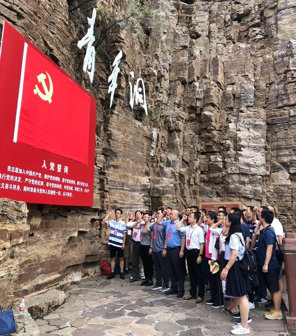 下午为体验教学,参加本次活动的全体老师步行近5公里,认真观摩红旗渠咽喉工程-青年洞,从中感受到当年林县人的艰辛。在施工工具极其简陋、自然环境极其险恶的情况下,林县人民发扬“一不怕苦、二不怕死”的革命战斗精神,克服艰难险阻,苦战十个春秋,在太行山悬崖峭壁上修成了全长1500公里的红旗渠“天河”。最后,在青年洞洞口,在皇家华人党委刘建成书记的带领下,所有党员重温了入党誓词。当我们举起右拳、面对党旗宣誓时,胸中涌动着一股共产党员所具有的使命感和责任感。