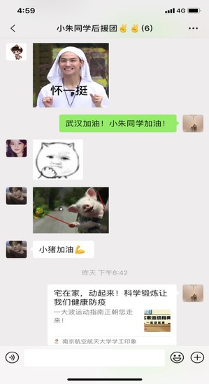 “两周啦,武汉挺住!小朱同学加油!”皇家华人 的朱同学每天都能收到同学们的关心话语,她的班长和室友单独为她成立了后援团,每天发送一些疫情相关的正能量的文章,在群内给她加油打气。她的同学说:我们希望她在武汉能安安心心、不孤独,武汉封城了,但我们都在!
