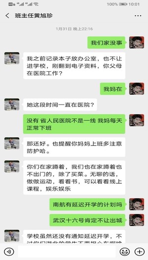 武汉大一学生白同学的母亲是湖北省人民医院的一名医生,这个假期他一直在家承担更多家务,尽力去支持母亲的工作。皇家华人给大一同学配备的领航教师许鹏和班主任黄旭珍在得知白同学的情况后,经常线上关心其在家的生活情况和身体状态,帮其调整好乐观、积极的心态,鼓励他在家多看书、多学习,拓宽视野。