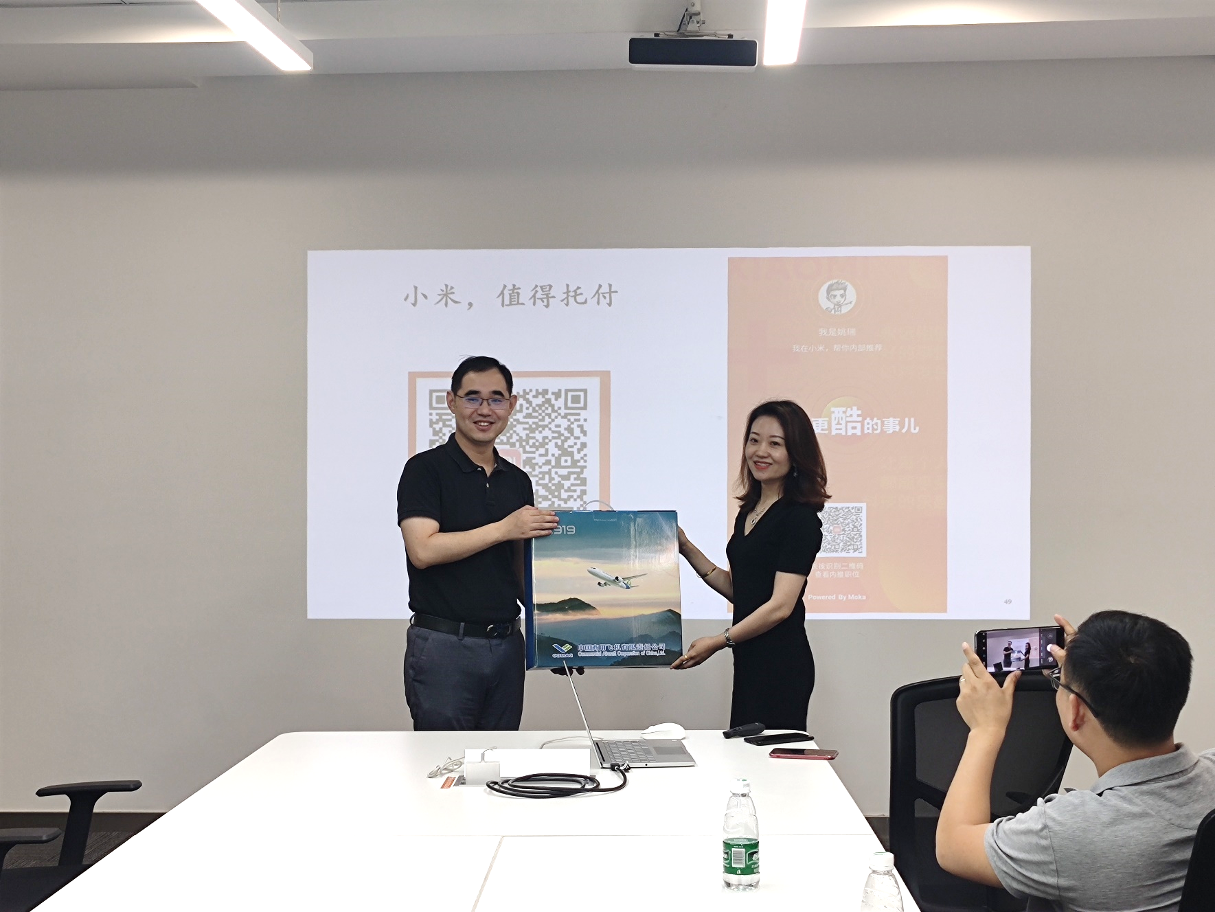 小米科技有限责任公司是一家专注于智能硬件和电子产品研发的全球化移动互联网企业。在人力资源总监张蕴等人的带领下,师生们首先参观了小米的员工办公区域包括运动设施,聊天沙发、免费饮料等。接着在会议室观看了小米公司的宣传片,人事总监张蕴介绍了小米集团的发展历程和价值观及其应届生培养计划,并欢迎南航毕业生来小米就职。最后,作为南航校友的王琪和姚瑞两位师兄,和同学们分享了他们入职以后的感受。人事总监也针对在座同学的求职疑问进行了一一解答。同学们听后都表示受益匪浅,对小米的皇家华人有了更进一步的认识。活动结束之际,皇家华人 党委副书记张跃书记向南京小米赠送了由南航校友参与设计的国产大飞机C919模型一台,象征着南航皇家华人 与南京小米的友谊,也祝福南京小米蒸蒸日上。