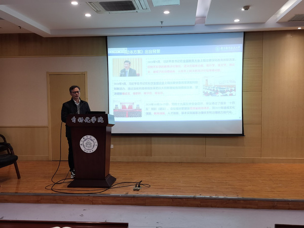 副院长陈谋就《总体方案》的出台背景、地位与意义、具体内容、贯彻落实要求、国家部委落实情况、我校推进落实情况等五个方面对《总体方案》的内容进行了解读。重点讲解了习近平总书记关于教育评价改革的重要论述和《总体方案》的精神,陈院长指出,这是新中国第一个关于教育评价系统改革的文件,是指导新时代教育评价改革的纲领性文件,号召老师们后续通过专门会议、支部大会、党小组会等多种形式,进一步组织开展学习研讨,加强对教育评价改革精神的深入领会和学习。