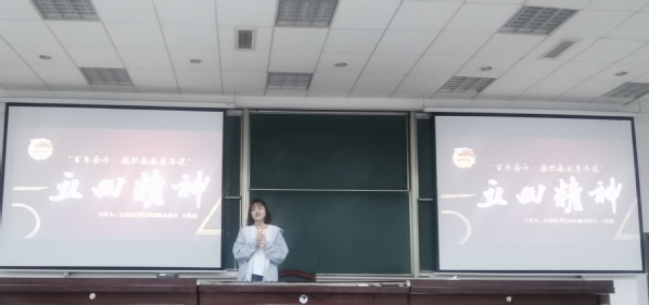 随后,本科生团干王敬怡带来题为《五四精神》的演讲。她娓娓道来,从恢弘壮阔的五四运动讲到逆行而上的抗疫狙击战,从革命青年邓颖超讲到硬核抗疫的医护人员。随着时代的发展,爱国、进步、民主、科学的伟大五四精神展现出历久弥新的精神魅力。王静怡通过讲述自身经历,强调了青年学子要传承和发扬五四精神,树立远大理想,热爱伟大祖国,担当时代责任,勇于砥砺奋斗,做走在时代前列的奋进者、开拓者、奉献者。