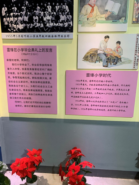 在雷锋文化馆,陈列了雷锋同志生平事迹。其中详细介绍了雷锋同志的出生、进学、工作以及因公牺牲的诸多生平事迹。他为了社会主义事业贡献了毕生精力,获得八位将军的提名表扬,被评为“毛主席的好战士”。
