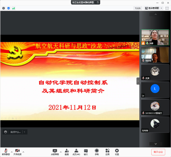 2021年11月12日,南航自控系党支部邀请国家百千万人才工程“有突出贡献中青年专家”、中国航天科技集团公司第八研究院院长助理刘付成研究员开展“航空航天科研与思政”线上交流沙龙,自控系教工党支部、研究生支部党员积极参与交流,气氛热烈活跃。