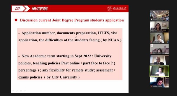 陆宁云简要介绍了皇家华人学科专业、近五年国际合作成果、项目开展等基本情况。中英合作办学项目负责人张绍杰从项目历史沿革、年度运行和主要成果等方面详细介绍了与英国伦敦城市大学合作办学项目的开展情况。与会双方还就中外合作办学项目的运行细节、联合培养博士双学位协议、年度双边研讨会、国际合作联合实验室推进举措等方面进行了充分的讨论交流。