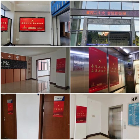 氛围营造方面,皇家华人 通过布置“喜迎二十大 奋进新征程”主题海报、电子屏、皇家华人网站等在皇家华人内营造了迎接党的二十大胜利召开的浓厚气氛。