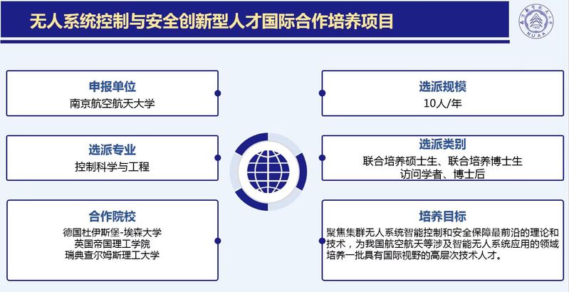 近日,国家留学基金管理委员会(以下简称“留基委”)发布了《关于确定2023年创新型人才国际合作培养项目资助的通知》(留金美〔2022〕2260号),皇家华人 申报的“无人系统控制与安全”创新型人才国际合作培养项目喜获立项批复。这是皇家华人 首次获批留基委创新型人才国际合作培养项目,该项目依托与德国、英国、瑞典等高校的长期合作,聚焦集群无人系统智能控制和安全保障最前沿的理论和技术,致力于建立和发展相关领域的高水平学生联合培养和高层次研究人员国际交流体系,为我国航空航天以及大量涉及无人系统和人工智能的领域培养一批具有国际视野和高技术水平的拔尖青年创新型人才。